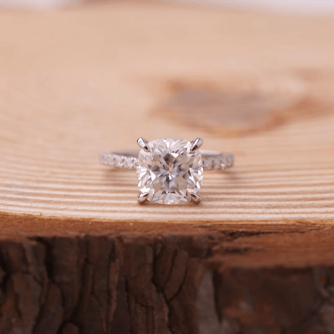 Embrace the elegance and brilliance of our Cushion Cut Engagement Ring, meticulously designed for women who appreciate both luxury and sustainability. This exquisite Moissanite ring features a captivating cushion-cut center stone, renowned for its exceptional sparkle and fire. The lab-grown Moissanite ensures an eco-friendly choice without compromising on beauty and quality. The ring's band is adorned with smaller Moissanite stones, enhancing the overall radiance and sophistication. Perfect for engagements, this ring symbolizes a commitment to both love and ethical luxury.