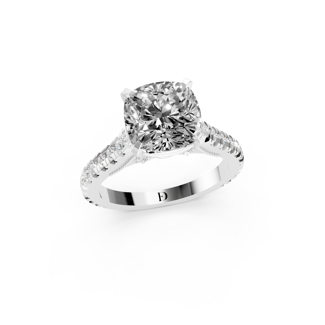 Celebrate refined elegance with the Cushion Diamond Graduation Set Engagement Ring a design that blends timeless beauty with delicate craftsmanship. At its heart rests a breathtaking Cushion-cut diamond, chosen for its elongated shape and exceptional brilliance. The center stone is securely set to capture and reflect light beautifully, creating a radiant sparkle that enhances the ring’s graceful silhouette Along the band, a series of carefully graduated diamonds gently increase in size as they approach the center stone. This subtle progression creates a flowing, harmonious look that naturally draws the eye toward the oval diamond, emphasizing its brilliance while adding dimension and sophistication to the design.