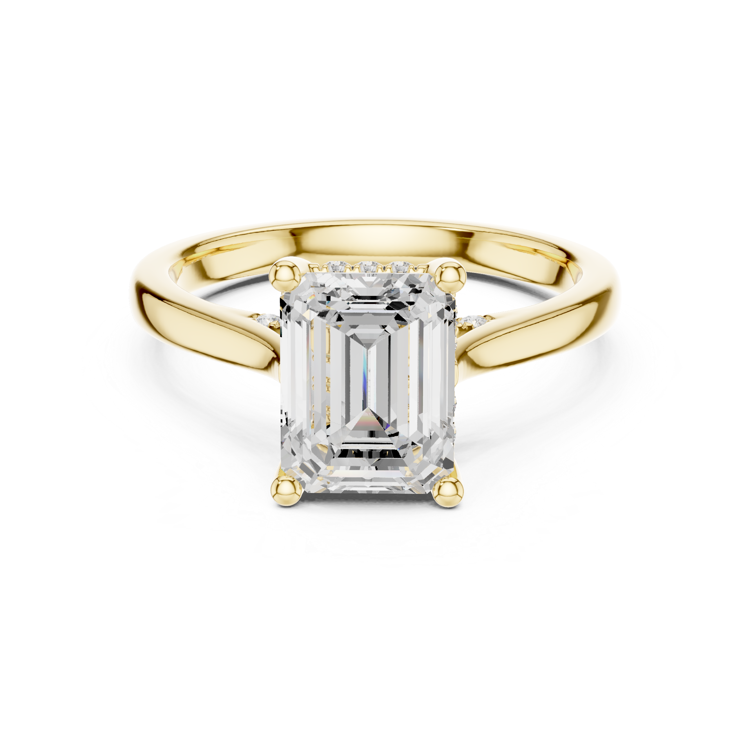 The Emerald Cut Solitaire Hidden Halo with Pavé Engagement Ring is a masterclass in geometric elegance and refined brilliance. At its center sits a striking Emerald -cut diamond, renowned for its iconic "hall of mirrors" step-cuts and sophisticated, vintage-inspired silhouette. This centerpiece offers a clean, architectural look that radiates a deep, rhythmic sparkle.