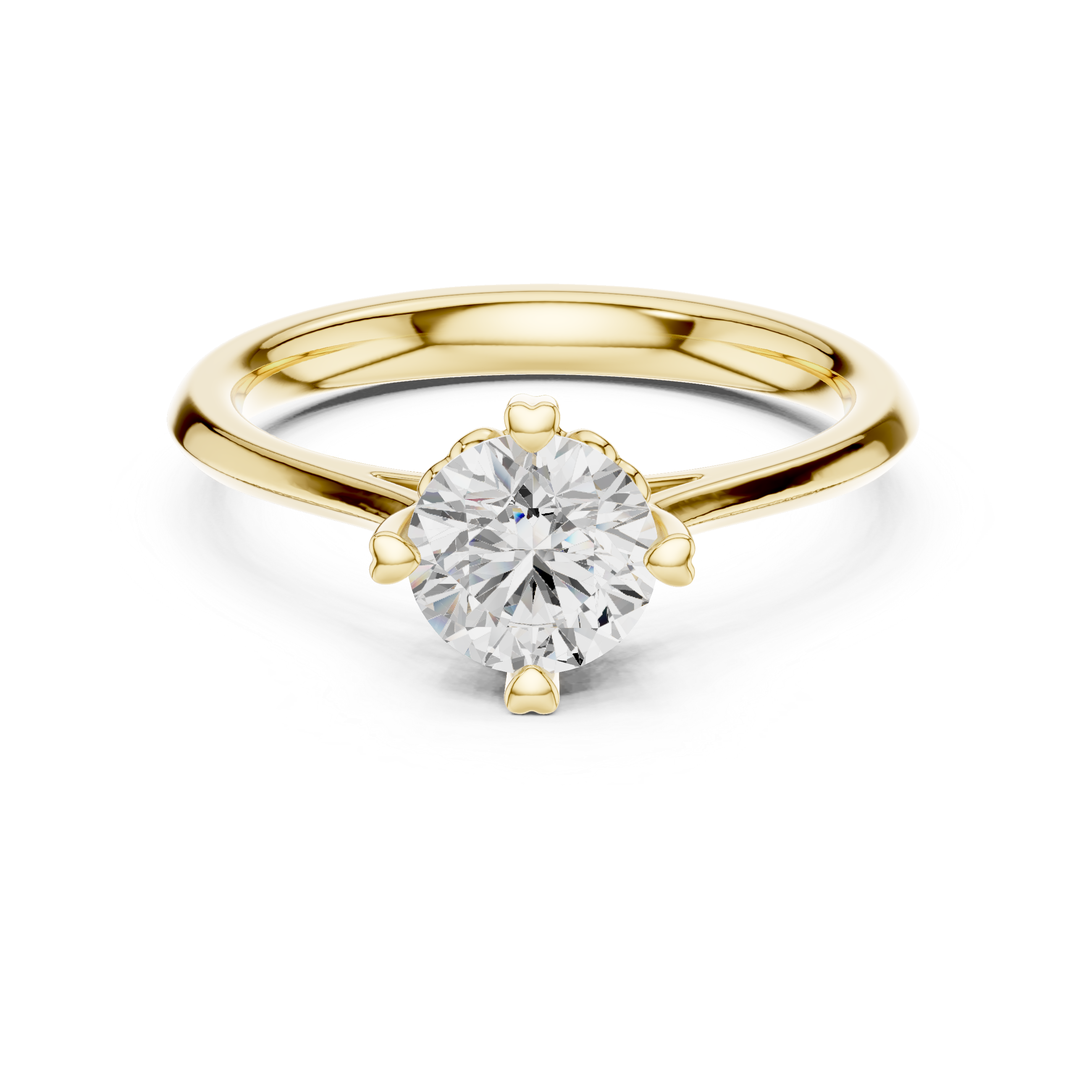 The Heart-Prong Round Diamond Solitaire Ring is a romantic twist on a timeless classic. At its center shines a brilliant round-cut diamond, admired for its exceptional sparkle and perfectly balanced symmetry. Its radiant facets reflect light beautifully, creating a captivating and luminous glow.What makes this ring truly special is its unique heart-shaped prong setting, delicately crafted to cradle the diamond while adding a subtle touch of romance. These elegant prongs not only secure the center stone but also enhance its beauty with a meaningful and charming design detail.