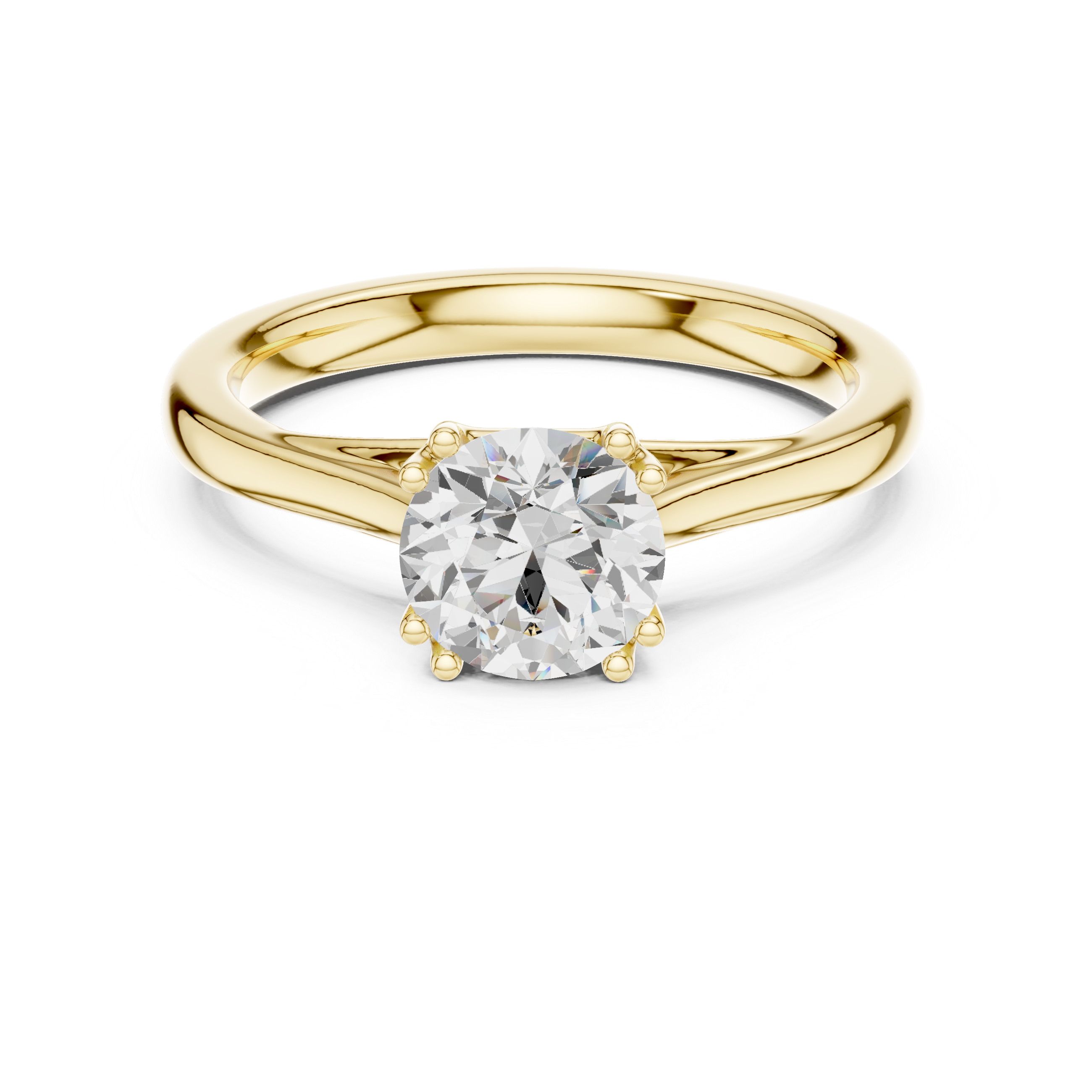 The Round Diamond Double Prong Cathedral Shank Ring is a graceful blend of classic elegance and refined craftsmanship. At its center shines a brilliant round-cut diamond, admired for its exceptional fire and timeless sparkle. Its perfectly cut facets capture light beautifully, creating a radiant and eye-catching brilliance.The diamond is secured with a distinctive double-prong setting, offering both enhanced protection and a delicate design detail that elevates the overall look. The cathedral shank gracefully arches upward to support the center stone, adding height and elegance while allowing more light to flow through the diamond for maximum brilliance.